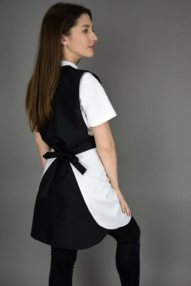 Фартук двусторонний, одевается через голову, завязывается по бокам на четыре пояса. Платье – фартук купить можно с декоративным воротником на круглом вырезе в верхней части. На правой груди имитация кармана, на который удобно прикреплять бейдж или табличку с именем сотрудника. В нижней передней части изделия один круглый карман с обтачкой.