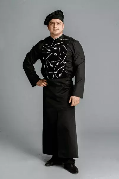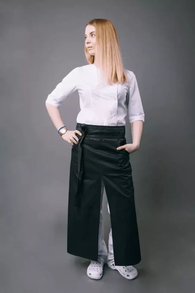 Прямоугольный фартук с разрезом обладающий водоотталкивающим свойством. Пояс удлиненный. Профессиональный фартукимеет вместительный карман, разделенный на три части, два боковых кармана со скошенным верхом, на углах кармана – закрепки.