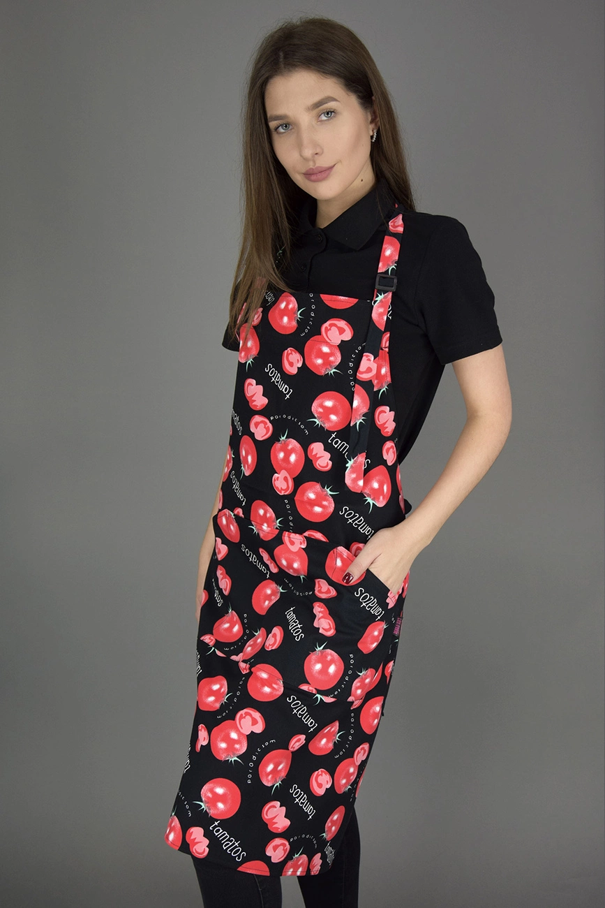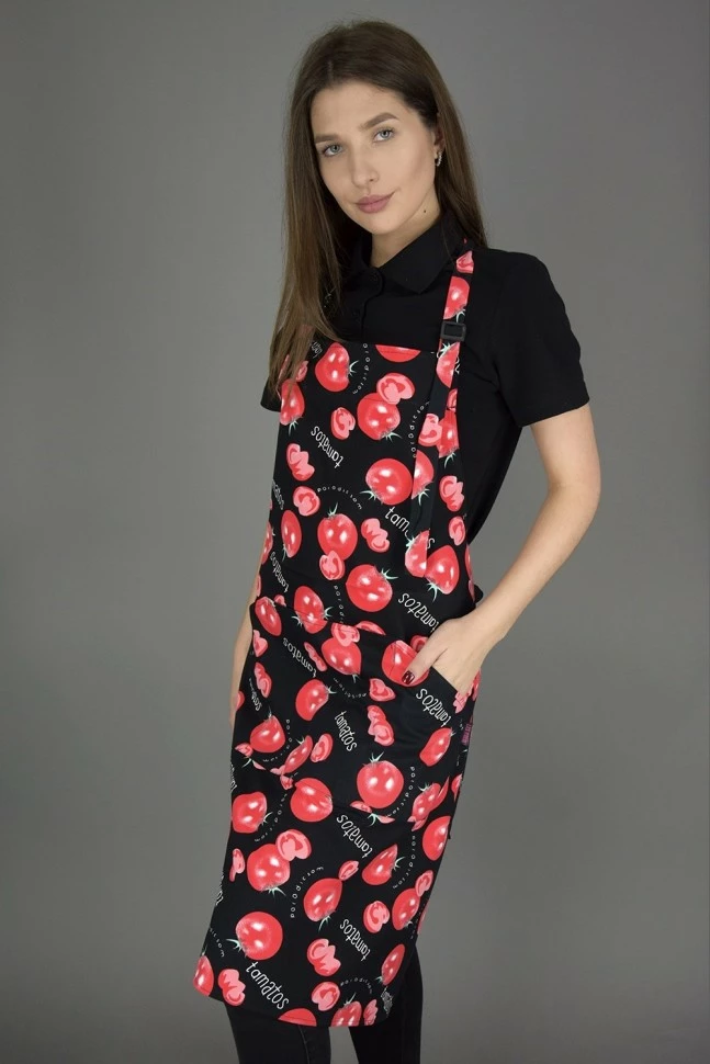 Фартук для кухни с нагрудником до колен с принтом «Томато». На шее длину хлястика можно контролировать при помощи пластмассового регулятора. В нижней части изделия – вместительный карман с тремя отделениями, два боковых со скошенным верхом.