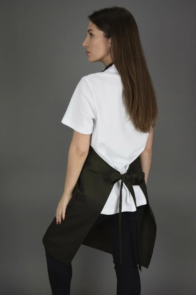Фартук форма "трапеция",с нагрудником .Имеет шейный хлястик с пластиковым регулятором ,с помощью которого можно регулировать длину фартука.