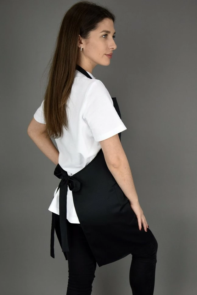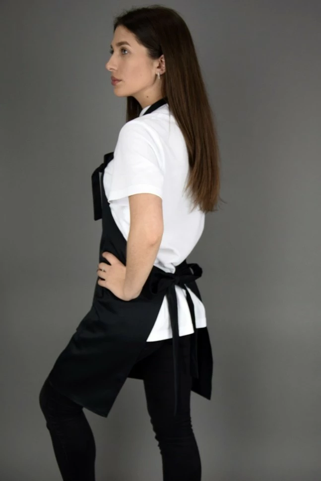 Фартук поварской профессиональный с нагрудником до колен. Шейный хлястик фиксируется благодаря петле, присутствующей на полотне фартука, хлястик продевается через петлю образуя узел. В нижней части изделия – два вместительных кармана со скошенным верхом.