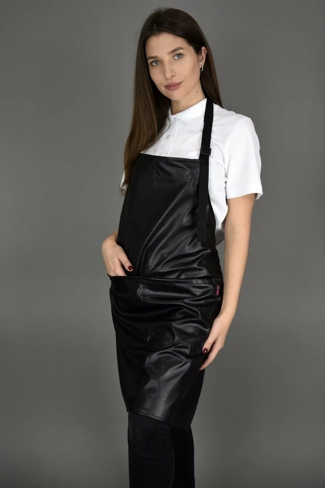Фартук форма "трапеция", с нагрудником. Имеет шейный хлястик с пластиковым регулятором, с помощью которого можно регулировать длину фартука.