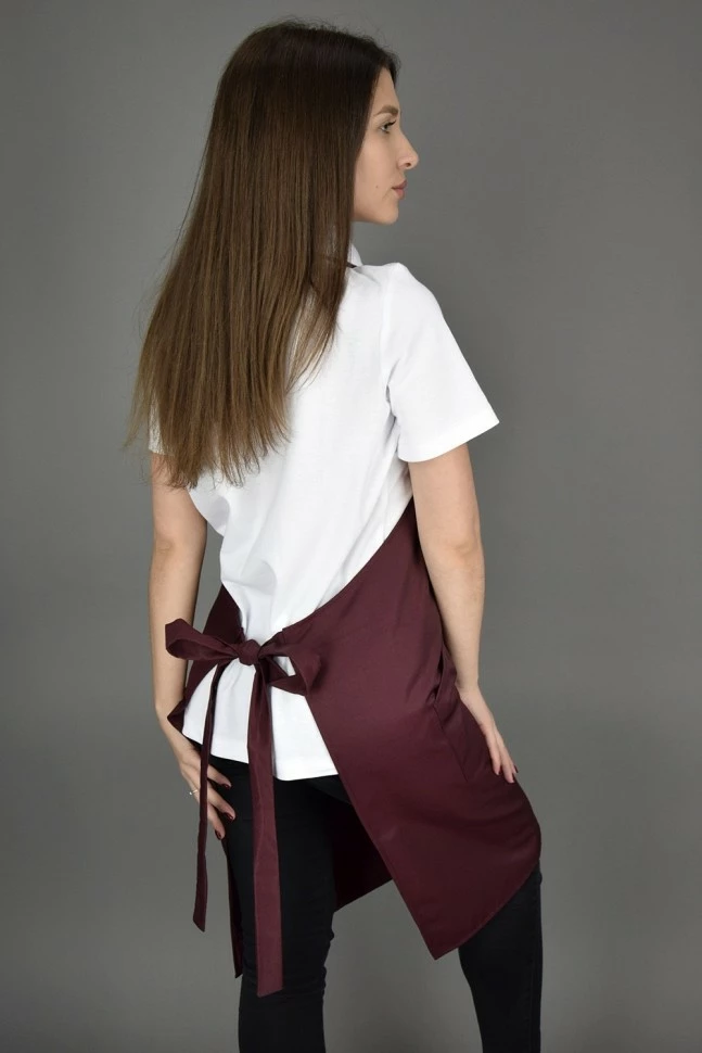 Фартук форма "трапеция",с нагрудником .Имеет шейный хлястик с пластиковым регулятором ,с помощью которого можно регулировать длину фартука.