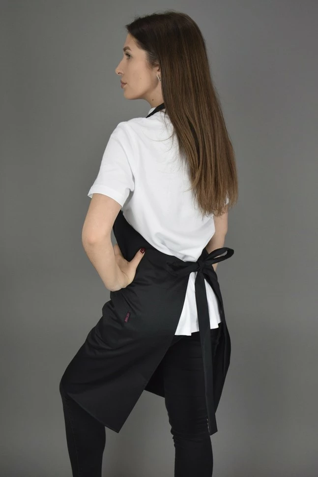 Фартук форма "трапеция",с нагрудником .Имеет шейный хлястик с пластиковым регулятором ,с помощью которого можно регулировать длину фартука.