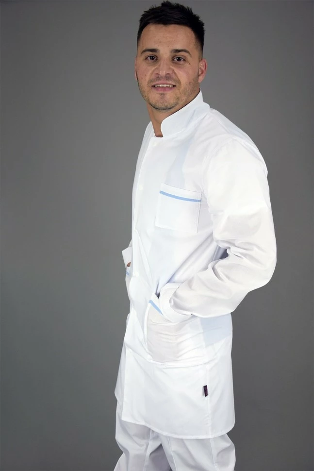 Халат мужской медицинский можно купить с полуприлегающим силуэтом, центральной бортовой застежкой – планкой на 7 кнопок. Присутствует один нагрудный и два боковых накладных кармана, выделяющиеся тонким кантом. Спинка прямая с втачными боковыми поясами на кнопках. Рукава втачные, длинные. Воротник стойка с цветной внутренней вставкой.