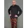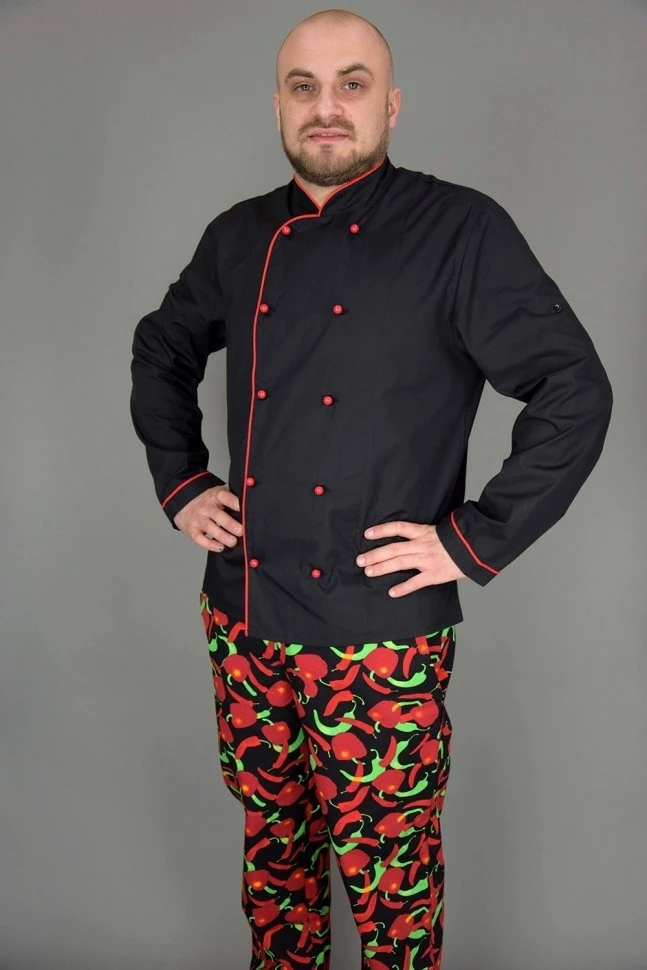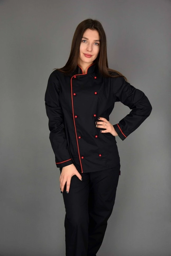 Поварская униформа - куртка-китель, черного цвета с красным тканевым кантом по краю ворота-стойки и борта. Двубортный китель полуприлегающего силуэта, застегивающийся на два ряда специальных пуговиц (пукли) красного цвета. Рукав втачной, длинный, но с возможностью подворота при помощи хлястика внутри рукава, фиксирующий рукав на пуговицу.