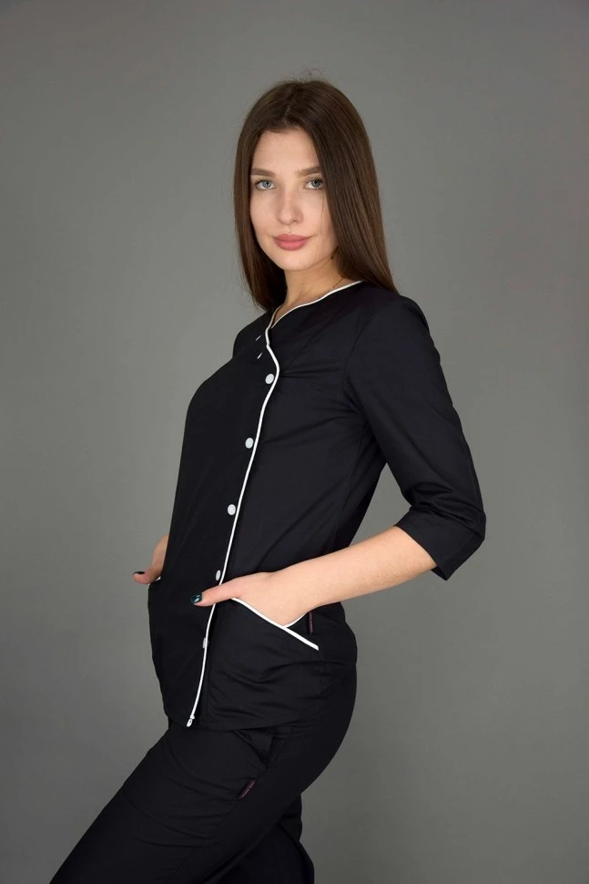 Универсальная женская кофта, присутствуют карманы в нижней части кофты, практичная застежка на кнопках.