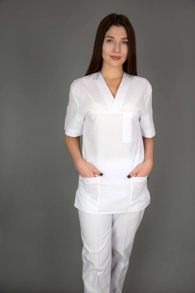 Комплектация: блузон – прямого силуэта с разрезами в боковых швах, перед с одним нагрудным и двумя боковыми накладными карманами, V- образный вырез горловины, обработан планками. Рукава медицинской спецодежды втачные, короткие; брюки – от бедра, прямой крой, на резинке.