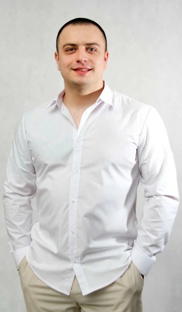 Классическая белая рубашка с длинным рукавом. На рукавах присутствует хлястик и пуговичка,которые позволяют регулировать длину рукава.