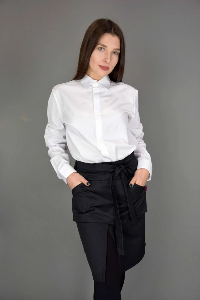 Классическая белая рубашка с длинным рукавом. На рукавах присутствует хлястик и пуговичка,которые позволяют регулировать длину рукава.
